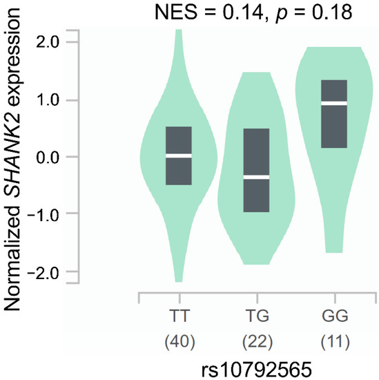 Association of SHANK2 expression levels with the rs10792565 genotypes in normal kidney cortex tissue based on the Genotype Tissue Expression data. Values in brackets represent the number of patients. NES, normalized effect size.