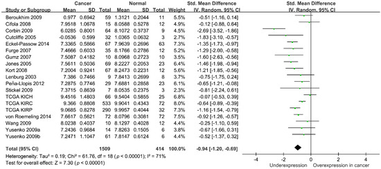 Pooled analysis of SHANK2 expression levels between cancer and normal tissues in 19 independent kidney cancer studies. Std., standardized; SD, standard deviation; IV, inverse variance; CI, confidence interval; df, degrees of freedom.