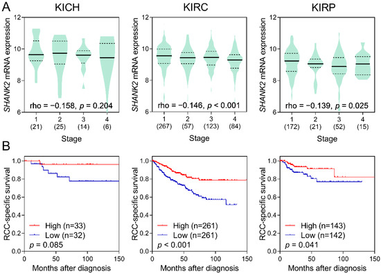 Correlation of SHANK2 expression levels with renal cell carcinoma (RCC) progression. (A) Downregulation of SHANK2 expression in advanced-stage RCCs, and (B) association of low SHANK2 expression levels with a poor cancer-specific survival based on The Cancer Genome Atlas kidney chromophobe (KICH), kidney renal clear cell carcinoma (KIRC), and kidney renal papillary cell carcinoma (KIRP) data. Values in brackets represent the number of patients; rho, Spearman’s rank correlation coefficient.