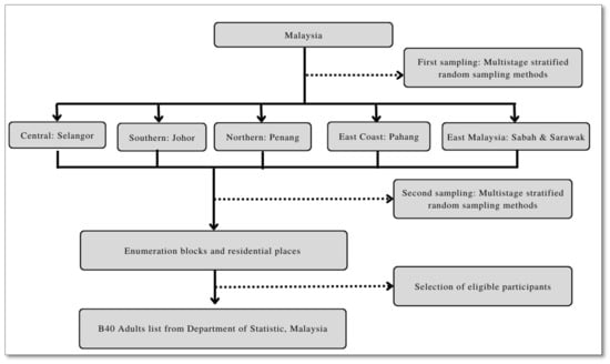 The sampling frame for this study was obtained from the DOSM. In the first stage, a stratified sampling technique is conducted to validate the representativeness of households across five major regions in Malaysia (Central: Selangor, Southern: Johor, Northern: Penang, East Coast: Pahang, East Malaysia: Sabah & Sarawak). The states were chosen from different regions to reflect broader results and represent the B40 group nationwide. In the second stage, the B40 households were selected as respondents based on their income group classification, where monthly earnings were below RM4,850 [4].