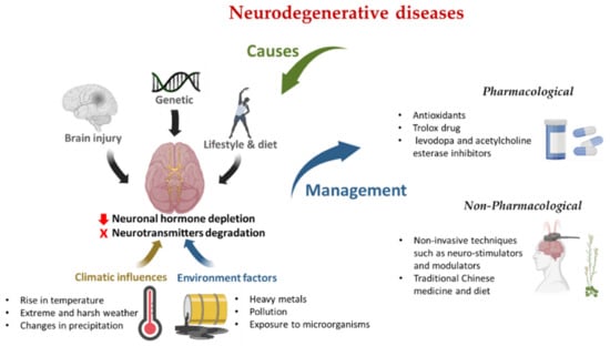 Neuronal drugs and interventions for managing NDDs focus on symptoms and short-term relief episodes. These drugs are accompanied by several side effects such as toxicity, low bioavailability, addiction, co-administration, neuro-inflammation, and higher doses regimen that could worsen diagnosis and deteriorate brain capability [37]. The non-pharmacological approaches, such as body exercises, running, physical activity, and emotional stability, are beneficial to enhancing the quality of life in patients with several types of neurological diseases [38,39], especially at the onset of the neurological diagnosis. Still, a lasting treatment would be desired to deflate the burden and brings hope to the management of NDDs. Therefore, this review discusses the roles of major neuronal hormones and neurotransmitters in the pathogenesis of NDDs and highlights the influence of environmental and climatic factors on their activities. Another potential aim of this review is to highlight the pharmacological and non-pharmacological strategies that could be implemented to control the NDDs progression triggered mainly by environmental and climatic factors. This can be achieved via defining the pathophysiological mechanisms of the NDDs and their relation to environmental and climatic changes. Hence, the pharmacological and non-pharmacological strategies for NDDs management will be explained accordingly to link each strategy with the appropriate environmental or climatic factors. Since controlling environmental and climatic factors that affect the neurotransmitters’ stability or hormones activity and promote the progression of NDDs is not always feasible; thus, the pharmacological and non-pharmacological approaches will be discussed as crucial NDDs management strategies.