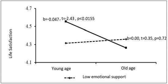 The PROCESS procedure was performed to learn the source of this interaction, and the Johnson and Neyman [55] approach was used to examine the significance of the slope at a large number of age cut-offs as dependent on the moderating variable of parental support (financial and emotional). The results revealed that at low levels of emotional parental support, age was not associated with life satisfaction (b = 0.00, t = 0.35, p = 0.72). However, when parental emotional support was higher, age was negatively associated with life satisfaction (b = −0.04, t = −2.24, p < 0.01). In other words, among young adults who receive considerable emotional support from their parents, life satisfaction declines the older they get (Figure 1).
