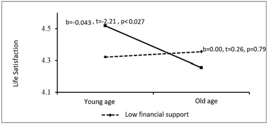 The same pattern was found for financial support. There was no association between age and life satisfaction at low levels of financial parental support (b = 0.00, t = 0.26, p = 0.79), but life satisfaction declined with age among individuals receiving more financial parental support (b = −0.04, t = −2.21, p < 0.02). Thus, as young adults get older, the more they rely on their parents for emotional and financial support, the less satisfied they are with their lives (Figure 2).