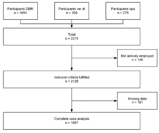A total of 2274 people engaged in a nursing profession, from three nationwide represented associations, took part in the online survey (DBfK n = 1691, bpa n = 275, ver.di n = 308). Respondents who were not actively employed (n = 146) and people with incomplete data with regard to the model’s variables were excluded from the analyses below (n = 161). The CCA included data entries from 1967 nursing staff (Figure 1).