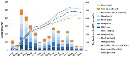 New adverse skin reaction (ASR) and their proportion (cumulative) with persistent complaints grouped by skin area over time from January 2020 to April 2021 (n = 1204, multiple answers possible).