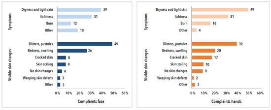 Figure 4 shows the complaints for the face and hands areas (including the wrists), categorised by symptoms and visible skin changes. Dryness and tight skin were the main symptoms both in the face and on the hands. Blistering, the development of pustules, skin redness, and swelling were the main visible changes reported in the face. For the hand area, cracked skin, redness, swelling, and skin scaling were the main changes (Figure 4).