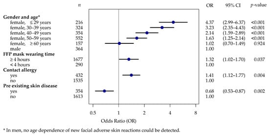 In the multiple logistic regression model with new facial ASR as the outcome variable, age, sex, FFP wearing duration, known contact allergy, and pre-existing skin condition were used as independent variables and controlled for each other (Figure 5). There was no multicollinearity (VIF < 2, tolerance > 0.95), and there was no evidence of a poor fit of the final model (p = 0.996). FFP wearing times of ≥4 h as compared with shorter wearing duration and a known contact allergy were associated with significantly higher risks of new facial ASR (OR 1.3 [CI 1.0–1.7; p = 0.037] and OR 1.4 [CI 1.1–1.8]; p = 0.004). The presence of a pre-existing skin disease had a protective effect in the cohort (OR 0.7 [CI 0.5–0.9; p = 0.002]). In comparison with men, women aged ≤29 years were 4.4 times [CI 3.0–6.4; p < 0.001] more likely to develop a new ASR on the face. Those aged 30–39 were 3.2 times [CI 2.4–4.4; p < 0.001], 40–49 year olds were 2.1 times [CI 1.6–2.9; p < 0.001], and the 50–59 age group was 1.6 times [CI 1.3–2.1; p < 0.001] more likely to develop a new facial ASR. Men and women aged over 59 years did not differ in their likelihood of developing a new facial ASR.