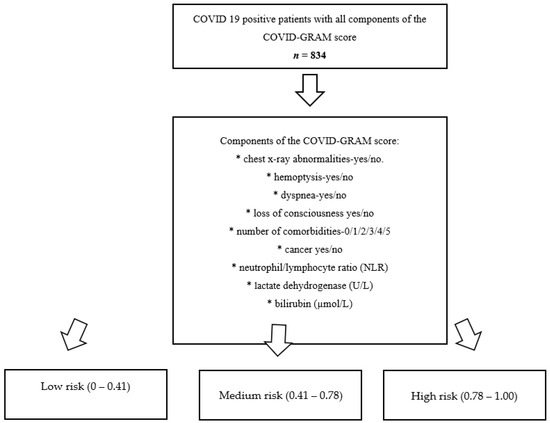 An early stratification of patients with a poor prognosis is extremely important, since it allows for the earlier and targeted application of appropriate therapies. One of the tools proposed to date in stratifying the risk of a severe COVID-19 course is the COVID-GRAM score [8], which was introduced in 2020 to assess more precisely the patients admitted to the hospital. The COVID-GRAM score includes ten independent predictive factors, i.e., pathological changes typical of COVID-19 in chest radiographs, patients’ age, hemoptysis, dyspnea, loss of consciousness, number of comorbidities, history of malignancy, neutrophil-to-lymphocyte ratio, LDH value, and bilirubin concentration. The mortality is the critical outcome for testing the efficacy of therapeutics in hospitalized patients with COVID-19.