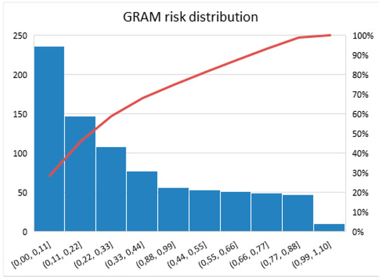 Pareto chart shows the percentage distribution of patients according to risk stratification on the GRAM score in patients with COVID-19 infection. The red line indicates the cumulative number (in percent) of patients with GRAM scores in each range.