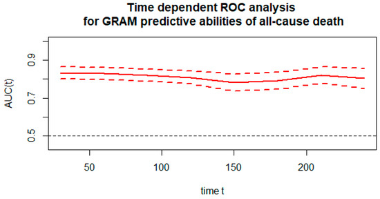 A timeROC analysis was conducted to assess the predictive ability of the COVID-GRAM score of deaths at the time from hospital admission. All causes of death were considered in the analysis, not only due to COVID-19 infection. Figure 3 shows the predictive abilities expressed as the area under the ROC curve versus time and the confidence intervals for this area.