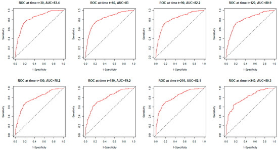 During the period studied, the quality of the classification was good. It dropped slightly to the fair class (Fair) in the short term. The AUC level then dropped to 78.2 (Figure 4). Figure 4 shows the ROC curves for the COVID-GRAM score for about 1 to 8 months ahead (30–240 days). The AUC value for the ROC curve at the corresponding time is presented in Figure 4.