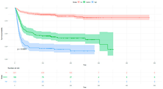 Considering the categorized model, a change from the low to medium category reduced the overall survival probability by more than 8 times, whereas from the low to the high stratum by 25 times (Table 6).