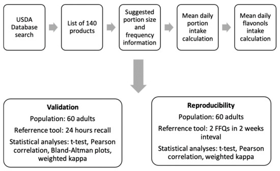The 24 h recall was taken 3 times (including one weekend day), and the FFQ was administered 2 times to a group of 60 healthy adults aged 20–32 (mean age 21.33 years, SD ± 2.08) at a two-week interval. The healthy population consisted of 48 women (80%) and 12 men (20%). The mean daily intake of selected flavonols was calculated for each participant. Statistical analysis was performed in rStudio software v. 4.2.0. The normality of the distribution of each parameter was checked with the Shapiro–Wilk test.