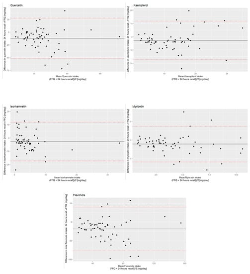 The comparison of the results of mean daily flavonols intake obtained via FFQ and 24 h recall were the basis for the validation of FFQ. The mean results from the FFQ were higher than from 24 h recall. This tendency has been already observed in other studies devoted to FFQ validation, so it was an expected pattern [32,33]. One reason for that is that the FFQ summarized the mean daily flavonols intake throughout a year, which could fluctuate due to the seasonal availability of some products (e.g., fruits and vegetables), while the 24 h recall gathered information during spring, which is a season when the local availability of fruits and vegetables is moderate. Nonetheless, the correlations between the results from FFQ and 24 h recall were significant for total and individual flavonols. The correlations for total flavonols, kaempferol, myricetin and isorhamnetin were high, and for quercetin, it was moderate suggesting that created FFQ is a valid tool for absolute flavonol intake assessment. The Bland–Altman analysis extends the process of validation beyond simple correlation assessment. It tests agreement between a method of interest (FFQ) and a reference method (24 h recall) by plotting the differences between these two dietary methods against the average of the two methods [24]. The mean differences between the intake assessed in FFQ and 24 h recall are presented on a Bland–Altman plot (Figure 2), and they were as follows: for total flavonols, 18.86 mg/day; for quercetin, 12.1 mg/day; for kaempferol, 2.77 mg/day; for isorhamnetin, 2.89 mg/day and for myricetin, 1.13 mg/day. The Bland–Altman index is the percentage of the results classified out of the 95% limit of agreement among all the measurements. The recognized limit for a good agreement between the methods is 5% [34]. This value was exceeded, so the results could not be interpreted as good agreement. However, there are other studies that present tools characterized by Bland–Altman indices within the range of 6–10% and conclude that they can still be effective for epidemiological studies, although not for individual fluctuation assessment [34,35,36,37,38]. Thus, this result was interpreted as a fair agreement between the two methods for epidemiological studies applications.