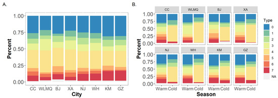 Frequency distribution of different pollution types in 8 cities ((A) all-year results; (B) seasonal results). The type of pollution and the pollutant classified as high level in this type are as follows, 0: reference type, none; 1: only PM2.5; 2: only NO2; 3: only O3; 4: PM2.5 and NO2; 5: PM2.5 and O3; 6: NO2 and O3; 7: PM2.5, NO2 and O3; NA: lacking values.