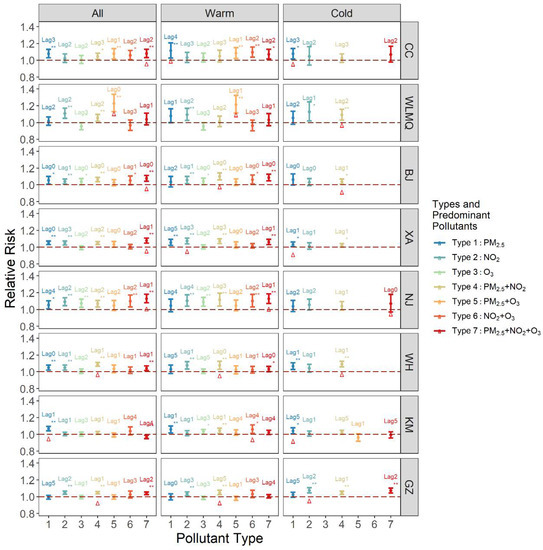 By comparing the greatest RR along lag0–lag5 of each pollution type (Figure 2), we identified the pollution types with the highest mortality risk throughout the year and in different seasons in each city (Table 4, Table 5 and Table 6). In all-year analyses, we found that the pollution types with the highest RRs in 7 cities except Kunming all belong to high multi-pollutant pollution types, that are type 7 (high O3, PM2.5, and NO2) and type 4 (high PM2.5 and NO2). In all eight cities, half of the types with the highest risks in each city were type 7, and the highest RR was 1.129 (1.080, 1.181) in Nanjing, and the mortality effect of type 7 was significant in all six cities except Kunming and Urumqi. In addition, type 4 was also significantly associated with death in 7 cities, with the maximum RR of 1.089 (1.066, 1.113) in Wuhan. Results from lag models indicated that exposure to high multi-pollutant air pollution on more recent days, such as from the same day to 2 days ago was associated with a larger risk of mortality than exposure on less recent days (such as three days ago or earlier). In terms of seasons, high multi-pollutant pollution types have a higher risk in most cities in the warm season than in the cold season. During the warm season, types 4 and 7 were most significantly associated with death, and type 6 (high O3, and NO2) was significantly associated with death in half of the cities. During the cold season, most of pollution types had the highest RR values of type 1 and type 4, and type 4 passed the significance test more than type 1.