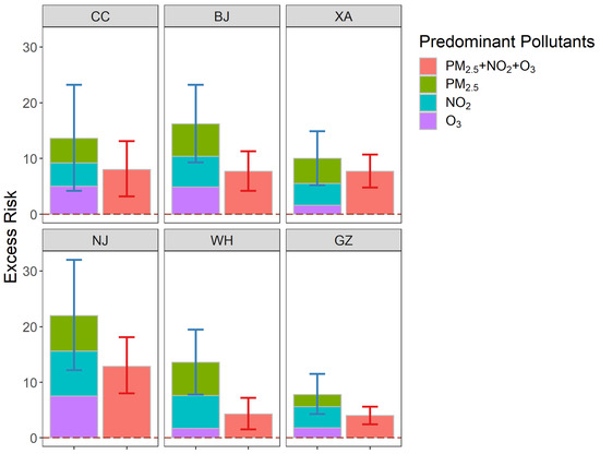 Furthermore, we compared the simple sum of the excess risks of individual pollutants at high levels with the excess risks of the multiple pollution type with all three pollutants simultaneously at high levels. The concentration levels of other pollutants are not taken into account when calculating the exposure risk at high levels for each pollutant alone. While calculating the impact of combined exposure, the concentration level of three pollutants is all considered, and the risk is calculated when the three pollutants are at high levels simultaneously. The results for each type of excess risk higher than 0 were listed in Figure 3. The results showed that combined effects that were less than simple additive.
