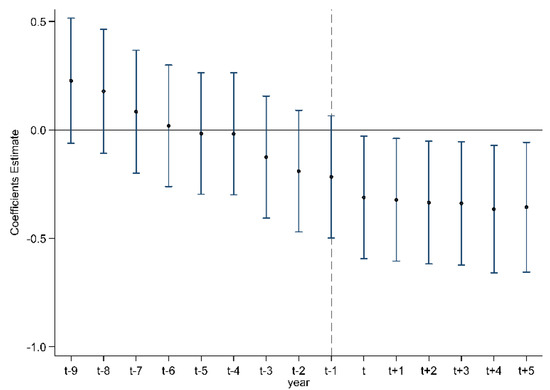 However, considering that the cities implementing the environmental information announcement system are widely distributed in the eastern, central, and western regions, and the cities are different, there are also great differences in the factor endowments between them. Therefore, we assume that these various factors lead to large differences between the cities in the control group and the control group, which may cause some biases in the results. Therefore, to further reduce the differences between samples and make the regression results more accurate, this paper adopts the propensity score matching method (PSM) to select the control group. Specifically, this paper performs period-by-period matching on the cross-section of the panel data to reduce the selection error of the control group. After excluding cities with large differences, DID regression is performed, and the results are shown in columns (3)–(4) of Table 3. It can be observed that regardless of whether or not adding control variables, the coefficient of environmental information announcement is significantly negative at the 1% level, which is consistent with the regression results before merging, which further indicates that environmental information announcement can effectively reduce firm pollutant emissions.