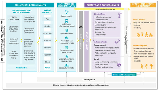 The different GHG-generating models mentioned above also define access to material and social resources, which have a direct effect on health. These include employment and working conditions, housework and caregiving, income and the economic situation, housing and the material situation, the residential environment, social capital, social support, and social networks, as well as education. Unequal access to these material and social resources along different axes of inequality, together with lack of power, are the main causes of existing health inequalities [28,29]. At the same time, this unequal access modulates exposure to the effects of climate change and adaptive capacity, thus exacerbating social inequalities in health.