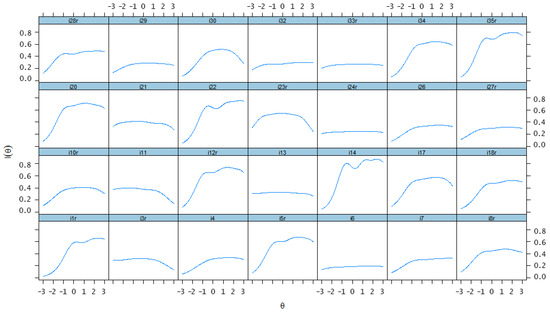 The item information refers to the empirical information a specific item can provide across the entire range of trait levels and can be described by the item information function (IIF). However, given that the sample size of the extreme trait levels is often small which may lead to inflated information and error, the more commonly used range of latent trait level is (−3, 3) [46]. It reflects how much useful information the single item can provide to the total scale, and the items with rather low information are recommended for removal when developing the short form of the scales. Test information is the sum of the item information of all items, reflecting the reliability of the total scale. The higher test information at a trait level means that the scale can provide estimation for the participants of the level more precisely, and the scale is more reliable at the trait level. Thus, on the basis of item information and test information, it was possible to select items that contributed more information to the whole scale.