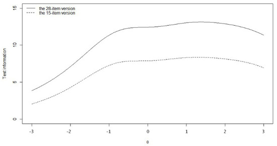 Though the 28-item scale was reliable, we want to further shorten the instrument for more efficient measurement. After the selection based on the item information and content, we obtained a 15-item scale which retained 62.80% of the test information of the D28-C over the D range of (−3, 3). However, it still provided test information of more than 5 across the trait level of (−1, 3), which means that the scale reliability was still acceptable at most levels of D (larger than 0.7) [53]. Given that personality psychological studies often tend to focus on the relationships among different variables, the questionnaire often consists of a number of scales. Thus, the shortened version of the D scale may be more effective in this situation.
