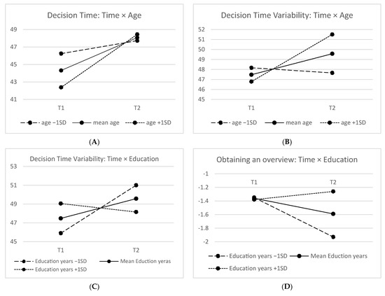 Finally, some significant interaction effects emerged between time and the covariates (see Figure 1). First, the effect of time on decision time was moderated by age: Improvements at T2 were larger (and significant) for older drivers (age >79). Second, the effect of time on decision time variability was moderated by age and education—improvements were significant for older drivers (age >84) with lower education (years < 9). Third, the effect of time on the perceptual ability to obtaining an overview was moderated by education—a decrease at T2 was larger for drivers with a lower education. Finally, the effect of time on selective attention was moderated by the length of the T1–T2 interval—the decrease at T2 was larger when the interval was longer.