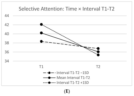 Significant interaction effects: (A) the effect of time on decision time by age; (B) the effect of time on decision time variability by age; (C) the effect of time on decision time variability by education; (D) the effect of time on perceptual speed by education; (E) the effect of time on selective attention by T1–T2 interval length.