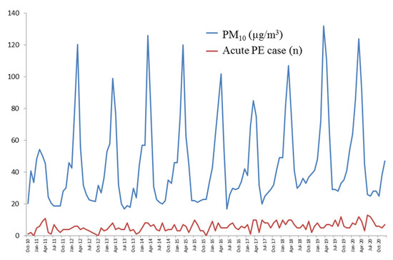 Variation in monthly average PM10 and monthly acute PE cases throughout the study period (October 2010–December 2020).