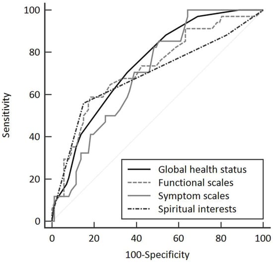 Logistic regression and ROC curves were used to determine correlations between the overall quality of life, sleep quality, spiritual interests, and demoralization status. Scores on the EORTC QLQ-C30 ≥ 62.5, functional scales ≥ 72.7, symptom scales ≥ 20.3, and C-SpIRIT ≥ 3.66 were associated with demoralization (Figure 1; Table 2). The results of univariate and multivariate analyses showed that the scores for C-SpIRIT (OR = 0.15, p < 0.001), EORTC QLQ-C30 ≥ 62.5 (OR = 0.21, p = 0.002), and C-SpIRIT ≥ 3.66 (OR = 0.11, p < 0.001) were strongly associated with demoralization (Table 3).