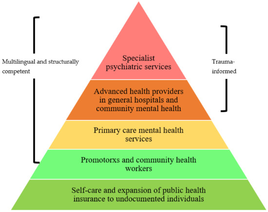- Kaltman, S.; Hurtado de Mendoza, A.; Serrano, A.; Gonzales, F.A. A Mental Health Intervention Strategy for Low-Income, Trauma-Exposed Latina Immigrants in Primary Care: A Preliminary Study. Am. J. Orthopsychiatry 2016, 86, 345–354. [Google Scholar] [CrossRef]