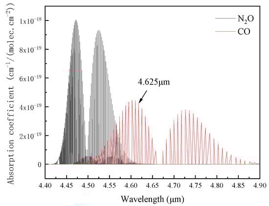 The selection of spectral lines is critical for gas measurement using TDLAS technology. The absorption spectra of CO and NO were shown in Figure 1. According to the HITRAN2012 spectral library, the pressure was 1 atm and the temperature was 296 K. In order to reduce the interference of N2O on CO detection, a laser source with a central wavelength of 4.625 μm was selected.