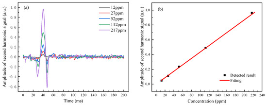Detected result of CO with different concentrations in the gas chamber based on TDLAS: (a) waveforms of the second harmonic signal; and (b) amplitudes of the second harmonic signal.