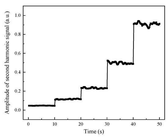 Different CO concentrations in the gas chamber were measured using the CO detection system based on TDLAS. In Figure 4, the detection results were displayed. The amplitude of the second harmonic signal (ASH) grew linearly with the gas concentration, confirming the concept. Calculations revealed that the ratio of ASH to the gas concentration was 4.431 × 10−3/ppm. The lower detection limit of CO in the gas chamber was approximately 12 ppmm. (1 ppmm means that the concentration of 1 ppm gas was distributed in the length of 1 m.) CO gas at a concentration of 240 ppb could be detected if a multipass absorption cell with an optical path length of 50 m was utilized. The CO gas concentration corresponding to the amplitude of various second harmonics of the gas detection system might be determined using the ASH of CO gas with varied concentrations in the gas chamber as the standard value. The signal-to-noise ratio can be improved, low-frequency background noise can be suppressed, and the limit of detection concentration can be lowered compared with the laser direct absorption detection technique. It can detect CO with low concentration; thus, gas leakage can be found at an early stage to keep people safe.