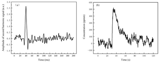 The silicon slices used for the gas cell windows had a thickness of 5 mm, and their transmittance at 4.625 μm was approximately 96.3%. Through the gas cell, about 14% of the laser’s power was lost. The ASH was proportional to the gas concentration and the laser emission power. According to the calibration of the standard concentration gas in the gas chamber, the ratio of the ASH in the open optical path to the gas concentration was 5.152 × 10−3/ppm (4.431 × 10−3/ppm/(1–14%)), and the minimum detectable concentration was about 10.32 ppmm (12 ppmm×(1–14%)). CO gas was sprayed in the optical path directly, and the measured second harmonic signal was shown in Figure 6a. The ASH was 2.638, and the concentration of CO gas in the optical path was approximately 510.6 ppmm. The concentration of CO in the optical path within two minutes was shown in Figure 6b. The detection result increased significantly right away after the gas was sprayed, and the concentration fluctuation during the gas diffusion was not significant. The CO content in the optical path immediately decreased as soon as the ventilation fan was turned on. The concentration of CO was much lower after one minute of ventilation, although there was still some CO gas present in comparison to before degassing. The diffusion of CO gas in the optical path was generally uniform because of the air movement. This system can detect the concentration of CO in the environment and give an alarm when the concentration exceeds the standard value. The detectable concentration is low, so that the danger can be detected in time. In confined spaces, timely ventilation can quickly reduce CO in the environment, thereby reducing the impact on health.