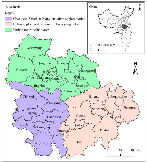 The MRYRUA is located in the central region of China. According to the Development Plan for Urban Agglomeration in the Middle Reaches of the Yangtze River [49], the MRYRUA is a super-large urban agglomeration mainly formed by the Wuhan metropolitan area, the Changsha–Zhuzhou–Xiangtan urban agglomeration, and the urban agglomeration around Poyang Lake (Figure 1), which includes 31 prefecture-level cities. It is the largest urban agglomeration in China, spread over 317,000 square kilometers (3.3% of China’s land) and with a population of 130 million (9.4% of China’s total population) in 2020. The MRYRUA has typical multi-center characteristics and has gradually formed a hierarchical and deep-level urban system [50]. The MRYRUA is a crucial area for implementing the strategy of promoting the rise of central China, thereby promoting new urbanization, and building a beautiful China. It has become a significant growth pole for China’s economic development and a primary space for building an ecological security barrier [51]. However, the development of the MRYRUA is relatively low, and it is still in the stage of rapid development [52]. The pressure on population, resources, and the environment is tremendous, and the problem of environmental pollution is prominent. The coordination between economic development, ecological environment, and people’s well-being needs to be urgently improved [53]. The 14th Five-Year Plan of China [54] has proposed optimizing the internal spatial structure of urban agglomerations; building ecological and security barriers; and forming multi-center, multi-hierarchy level, and multi-node urban network urban agglomerations. Therefore, evaluating the EWP of the MRYRUA from a hierarchical perspective is of great significance to its sustainable economic, social, and environmental development.