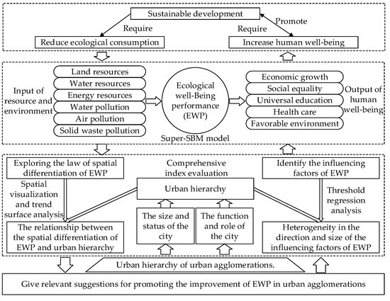The world is facing threats such as resource shortages, environmental pollution, ecological imbalance, climate change, and global poverty. How to coordinate the relationship between resource and environmental consumption, economic growth, and improvement of well-being within the ecological boundary has become a hotspot of global concern in recent years [1]. According to the United Nations Department of Economic and Social Affairs [2], urbanization will continue in more developed and less developed regions, with urban areas hosting 68% of the world’s population by 2050. Although global urbanization promotes economic prosperity and social progress, it has also brought severe ecological and environmental problems [3], such as ecological deterioration, environmental pollution, and excessive resource consumption, causing increasingly severe coercive effects and also far-reaching effects in regard to resources and the environment. This situation is challenging in urban agglomerations with high population density, as these factors restrict the improvement of human well-being and are unconducive to sustainable development [4]. In this context, the solution of how to coordinate the relationship between the economy, society, and the environment and improve people’s well-being has become the focus of governments, related organizations, and researchers. The United Nations 2030 Sustainable Development Goals (SDGs) propose to promote human well-being in poverty reduction, education, health, and social equity, as well as solve environmental problems in climate change, resource utilization, and terrestrial ecology [5]. These goals therefore aim to promote the sustainable development of the economy, society, the environment, and to improve human well-being [6]. Based on the SDGs, the United Nations Sustainable Development Solutions Network conducted a dynamic assessment on the sustainable development goals of European and American cities. Even the top cities in the index were still far from achieving sustainable development goals [7]. The 2022 Sustainability Report also showed that under the confluence of multiple international crises—such as COVID-19, climate change and the rise of regional conflicts—the progress of SDGs, which is a global goal, has stalled [8]. In its America 2050 strategic spatial plan, the United States formulated corresponding plans to deal with issues such as the energy crisis and global climate change, inefficient land resource use, and ecosystem pressure in mega metropolitan areas [9]. China has proposed a series of major national strategies, such as ecological civilization construction and high-quality development. The government of China wishes to further coordinate the relationship between economic development, ecological environment, and people’s well-being and, as a result, accelerate the transition from “economic well-being” to “ecological well-being”. These developments show that balancing the relationship between economic growth, ecological environment, and the improvement of well-being still requires further exploration. Sustainable development requires minimizing the impact on resources and the environment and maximizing human well-being [10,11,12], indicating a greater emphasis on improving ecological well-being performance (EWP). With the strengthening of mobility of economic resources, and other factors of production in regional urban networks, scattered cities have gradually evolved into highly integrated clusters of cities and urban agglomeration [13]. Urban hierarchy (UH) is based on the status and role of all cities in the urban system, and it also determines the scale and function type of the towns in the urban system to some extent [14]. Cities of different sizes in the urban agglomeration have formed a hierarchical structure with orderly scales and reasonable division of labor, which is an essential cornerstone for improving collective efficiency [15]. Improving the overall EWP of urban agglomerations, based on giving full play to the role of cities at all hierarchical levels and achieving sustainable development, is a practical problem facing China and other countries. Therefore, it is necessary to study the spatial differentiation of EWP according to the hierarchical characteristics of cities in urban agglomerations. It is also necessary to analyze the differences in the direction and extent of the influence that factor in EWP, against the backdrop of different hierarchy levels. In this way, different reference paths can be provided for cities at different levels to improve EWP.