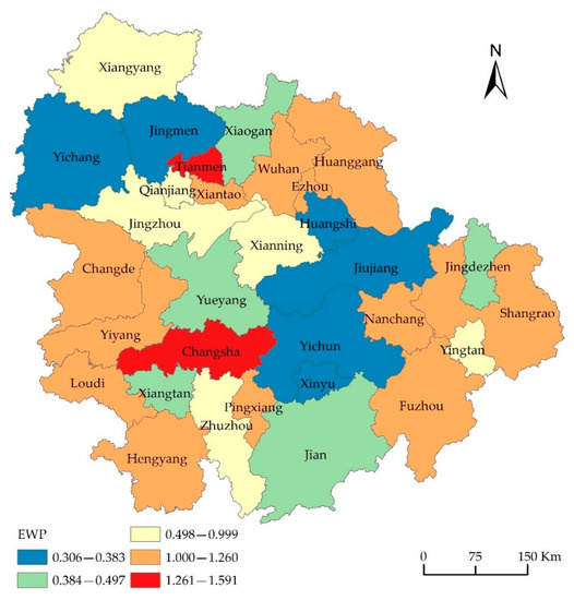 EWP was graded using the natural breaking point classification method. The spatial distribution of EWP of the MRYRUA (Figure 3) was visualized through ArcGIS10.2. The trend surface analysis graph (Figure 4) was visualized by the trend analysis tool.