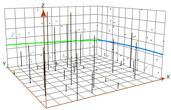 Trend analysis results (the arrow on the X-axis indicates an eastward direction. the arrow on the Y-axis indicates a northward direction. The Z-axis indicates the EWP value. The green line indicates the trend of EWP in the east-west direction. The blue line indicates the upward trend of EWP in the south and north).