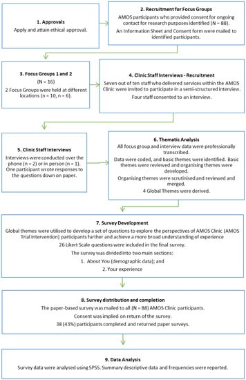 The research team used key themes identified in the focus group and interview data to inform the development of a 26-item paper-based participant self-report survey. The aim was to survey the broader cohort of intervention participants who had attended the AMOS Clinic to provide further clarity on experiences and opinions. The survey included closed-ended questions to assess the relevance of the focus group themes to the broader AMOS participant cohort and three free-text sections to capture additional participant experiences. A second external researcher reviewed the survey questions to ensure the meaning was clear. Participants were mailed an information sheet explaining the study, the survey, and a reply-paid envelope. They were asked to return the survey within eight weeks.