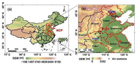 (a) Map of study area, and (b) locations of the air-quality monitoring sites in Beijing and Henan.