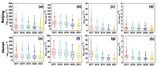Yearly variations in the concentrations of PM2.5, NO2, SO2, and CO during 2017–2021 in Beijing and Henan. (a–d) show annual concentrations of PM2.5, NO2, SO2, and CO during 2017–2021 in Beijing, respectively, and (e–h) show annual concentrations of PM2.5, NO2, SO2, and CO during 2017–2021 in Henan, respectively.The box frames represent the upper and lower quartile, the line represents the median, the whiskers denote the range within 1.5IQR, the square point within the box frame represents the mean, and the points outside the box frame represent outliers.