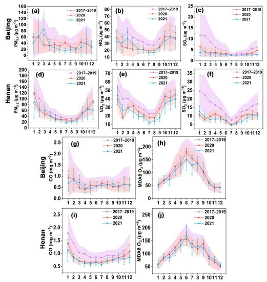 Monthly variations in the concentrations of PM2.5, NO2, SO2, CO, and MDA8 O3 during 2017–2021 in Beijing and Henan. (a–c,g,h) show monthly concentrations of PM2.5, NO2, SO2, CO, and MDA8 O3 during 2017–2021 in Beijing, respectively, and (d–f,i,j) show monthly concentrations of PM2.5, NO2, SO2, CO, and MDA8 O3 during 2017–2021 in Henan, respectively. The light-shaded areas or error bars represent the standard deviation.