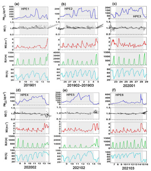Time series of PM2.5 concentrations, wind direction (WD), wind speed (WS), boundary layer height (BLH), and relative humidity (RH) during six heavy PM2.5 pollution episodes (HPEs) in Beijing. (a) HPE1, (b) HPE2, (c) HPE3, (d) HPE4, (e) HPE5, and (f) HPE6.