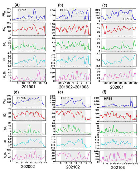 Time series of air pollutant concentrations during six heavy PM2.5 pollution episodes (HPEs) in Beijing. (a) HPE1, (b) HPE2, (c) HPE3, (d) HPE4, (e) HPE5, and (f) HPE6. PM2.5, NO2, SO2, and O3_8h concentrations are in μg m−3, and CO concentrations are in mg m−3.