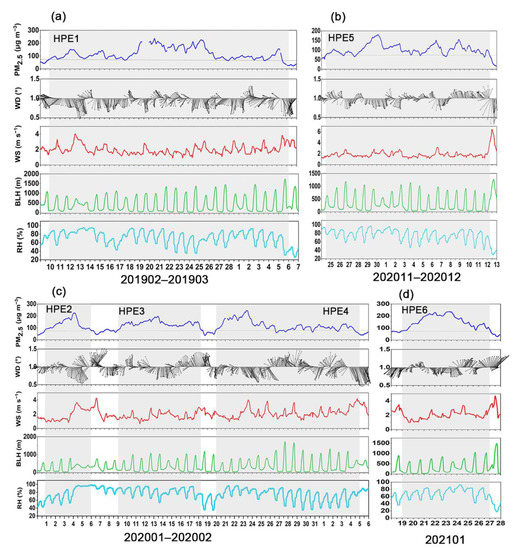 Time series of PM2.5 concentrations, wind direction (WD), wind speed (WS), boundary layer height (BLH), and relative humidity (RH) during six heavy PM2.5 pollution episodes (HPEs) in Henan. (a) HPE1, (b) HPE5, (c) HPE2, HPE3, and HPE4, and (d) HPE6.
