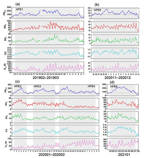 Time series of air pollutant concentrations during six heavy PM2.5 pollution episodes (HPEs) in Henan. (a) HPE1, (b) HPE5, (c) HPE2, HPE3, and HPE4, and (d) HPE6. PM2.5, NO2, SO2, and O3_8h concentrations are in μg m−3, and CO concentrations are in mg m−3.