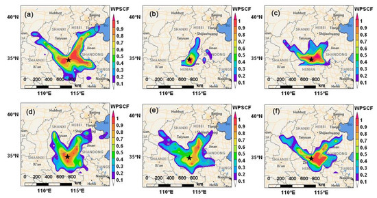 Maps of weighted potential source contribution function (WPSCF) for PM2.5 arriving in Henan during the six heavy PM2.5 pollution episodes (HPEs). (a) HPE1, (b)HPE2, (c) HPE3, (d) HPE4, (e) HPE5, and (f) HPE6.