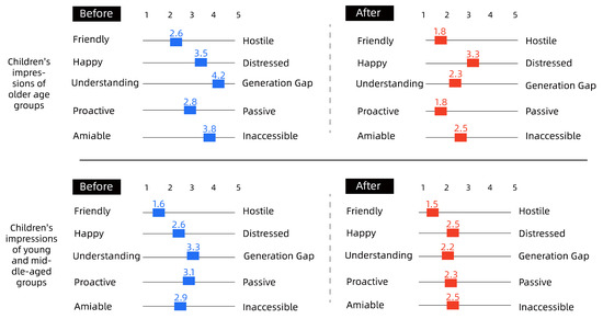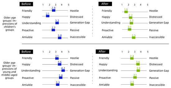 Overall, as shown in Figure 7, Figure 8 and Figure 9, there was a degree of improvement in perceptions of each other through the collaborative intervention, especially in the ‘Understanding-Generation Gap’, ‘Proactive–Passive’, ‘Amiable–Inaccessible’ scales; for example, children’s perceptions of the older group as generational and inaccessible before the intervention decreased significantly, from 4.2 to 2.3, 2.8 to 1.8 and 3.8 to 2.5, respectively. The attitude of children to young and middle-aged people had also obviously changed; for example, the indicator of ‘Understanding-Generation Gap’ went from 3.2 to 2.2, and the indicator of ‘Proactive–Inaccessible’ went from 3.1 to 2.3; the change in the older group’s attitude toward other groups was relatively small, but during the interview, many older people said they were better able to understand the children after hearing their perspectives and desires. Regarding the insignificant difference in the impressions of the middle-aged group, it could be seen from the graph that the overall impressions of the middle-aged group before the intervention were more positive toward the older group and the child group. As such, the difference between before and after the intervention was small, and the changes in values were mainly concentrated in ‘Understanding-Generation Gap’ and ‘Proactive–Passive’. The authors then conducted a study on middle-aged participants. The summary of the research results showed that the middle-aged group’s own cognitive judgment is more solid, and that the results do not change significantly. For more information on the scales, please refer to the Supplementary Materials, Supplementary S1 (Community Needs) and Supplementary S2 (Survey).