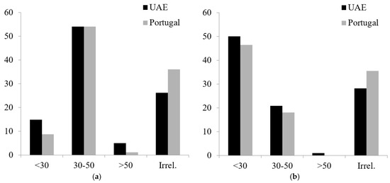 Considering each country, the percentage of the items measuring beliefs about the probability of getting BC and undergoing screening to prevent BC is reported in Figure 1. A chi-square test of independence was performed to examine the association between the beliefs and the two nationalities. The association between these variables was significant for the following items: beliefs about age probability of getting BC in their 20s and 30s and after their 50s, in which Emirati students hold a stronger belief than the Portuguese. Concerning the belief that “age does not matter to get BC,” the association was significant. The Portuguese students hold a stronger belief than the Emirati students (χ2(3642) = 18.090, p < 0.001). There were no significant associations concerning beliefs about the age to undergo screening for BC and the participants’ nationality.