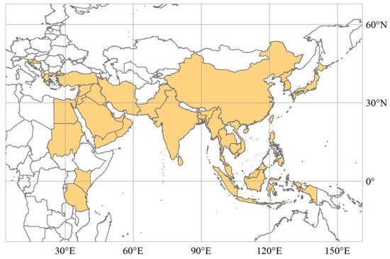 The MSRCs have no precise spatial scope as part of the BRI [3]. Historically, the Maritime Silk Road has mainly included the East China Sea shipping routes, South China Sea shipping routes, and North American and South American shipping routes. Since the vast majority of American countries have not signed a Belt and Road cooperation agreement or memorandum with China, this study focuses on the East China Sea shipping route countries and South China Sea shipping route countries. Combined with the ancient Maritime Silk Road route and reference data availability, we selected 39 MSRCs that are shown in Figure 1 as the study area. To facilitate the analysis, the 39 MSRCs besides China were divided into three East Asian countries, nine Southeast Asian countries, four South Asian countries, fourteen West Asian countries, five Balkan countries, and four African countries (Table 1). The research data mainly came from the UN Comtrade database, World Bank data, CEPII databases, GDELT Event Database, China Statistical Yearbook, World Investment Report, China foreign investment statistics bulletin, Statistics Bureau of the People’s Republic of China, the website of the Ministry of Foreign Affairs of the People’s Republic of China, the website of the Ministry of Commerce of the People’s Republic of China, the website of the National Bureau of Statistics of the People’s Republic of China and the website of Wuliu Baba. Although the trade data between China and MSRCs from 2006 to 2020 can be obtained, there is a lack of investment data between China and MSRCs after 2017, which makes it impossible to measure the linkage intensity between China and MSRCs and the characteristic importance of geo-economic relation type indices after 2017. Therefore, this study analyzes geo-economic linkages and their types between China and MSRCs from 2006 to 2017.